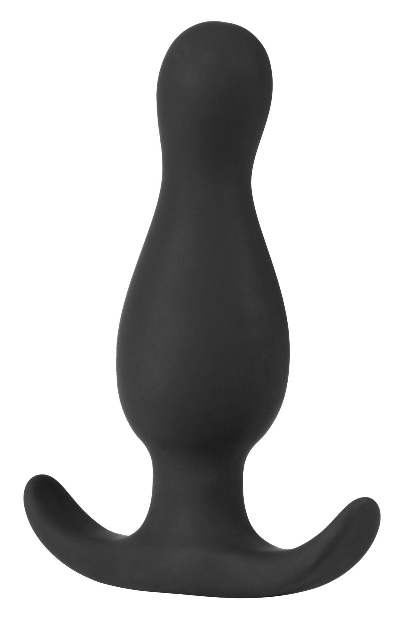 Black silicone anal plug with a curved tip for exciting anal stimulation. Total length 8.9 cm, insertable length 7.5 cm and diameter 1.7–2.7 cm. More Information