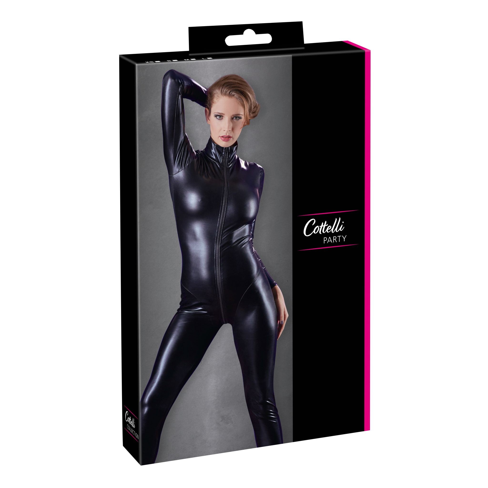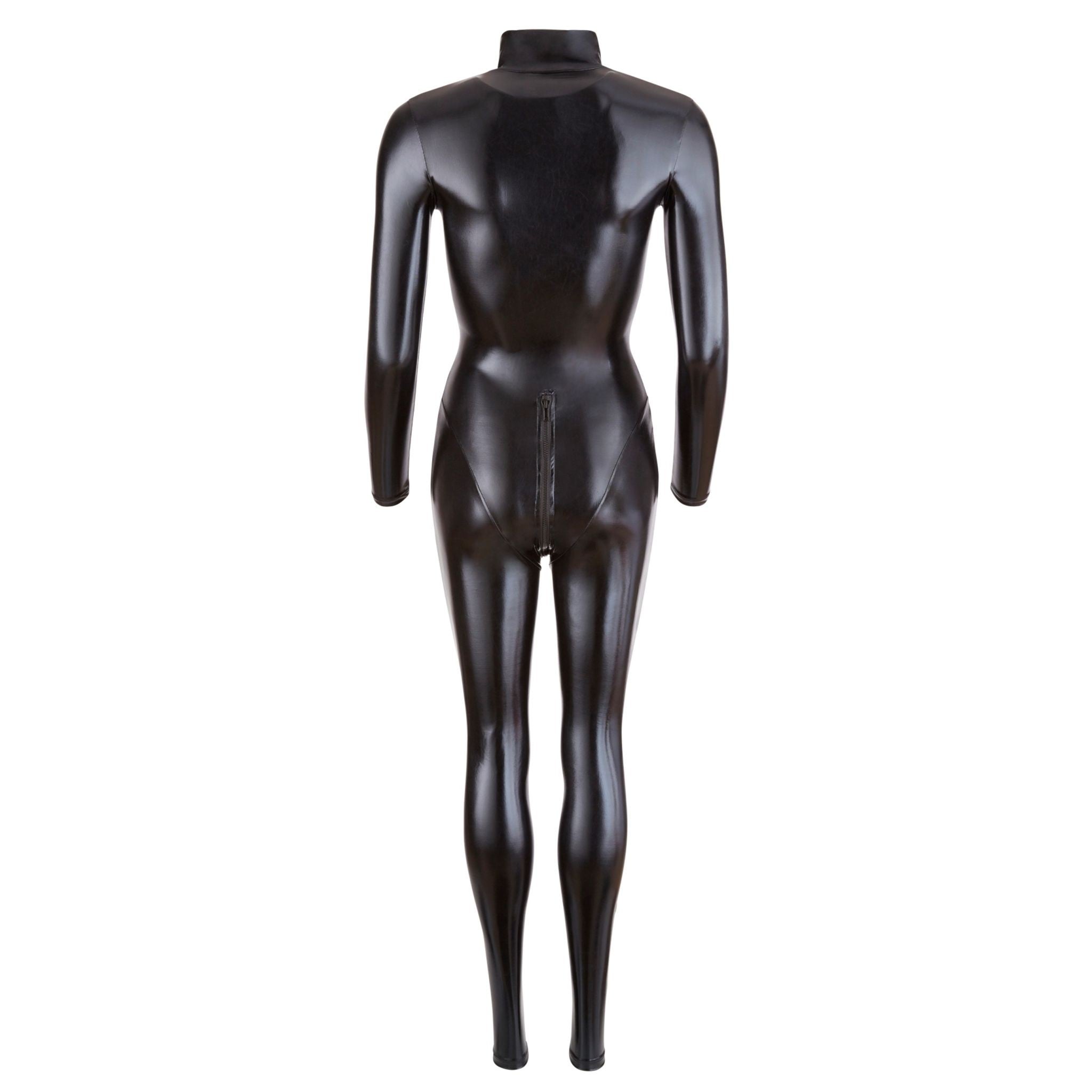 A form-fitting black catsuit made of shiny elastic material that hugs the body like a second skin. It has long sleeves and legs, a stand-up collar, and a practical two-way zipper running from the neck through the crotch to above the buttocks. Material: 92 % polyester, 8 % spandex. More Information