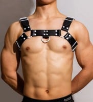 Black men's harness with buckles and studs in contrasting colour. Carefully made to accentuate your figure and draw all the attention to you. It features D-rings on the front and back to attach additional bondage accessories. Made of high-quality faux leather. More Information