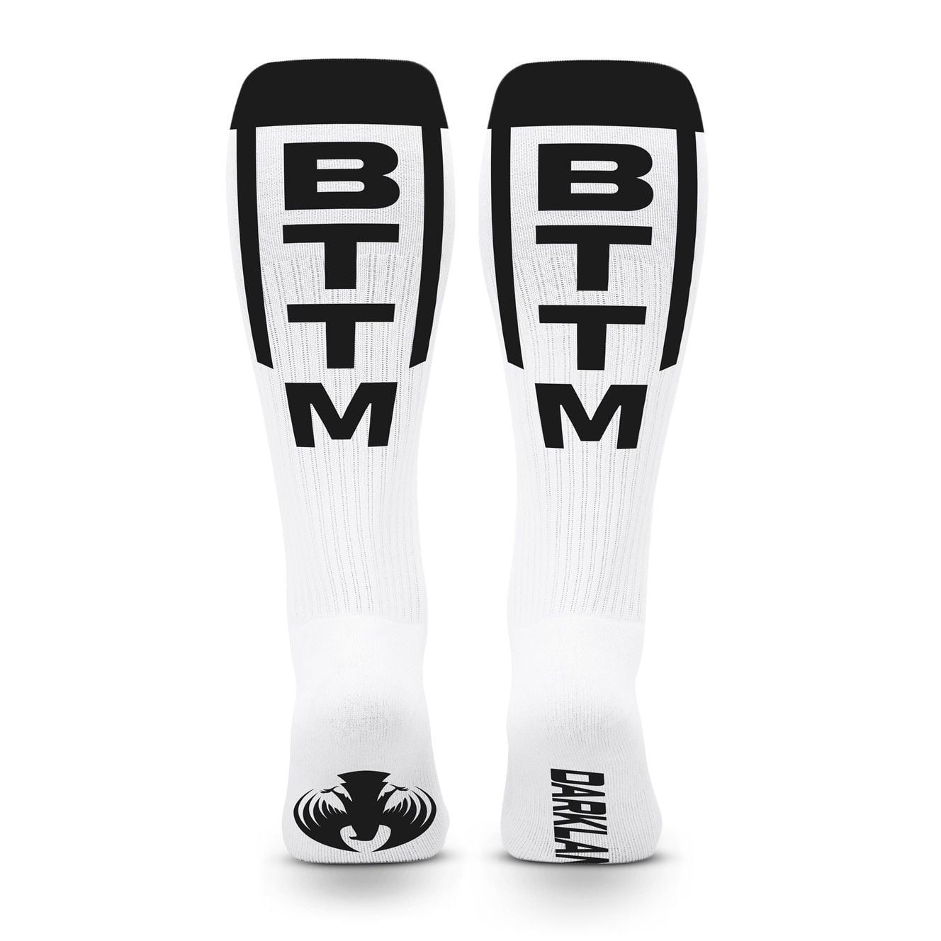 White knee socks with the BTTM lettering and the Beyond Darklands festival logo. They also come with two samples of lubricant from Fuck & Fist. One size (39-45). Material: 85 % cotton, 10 % polyamide, 5 % elastane. More Information