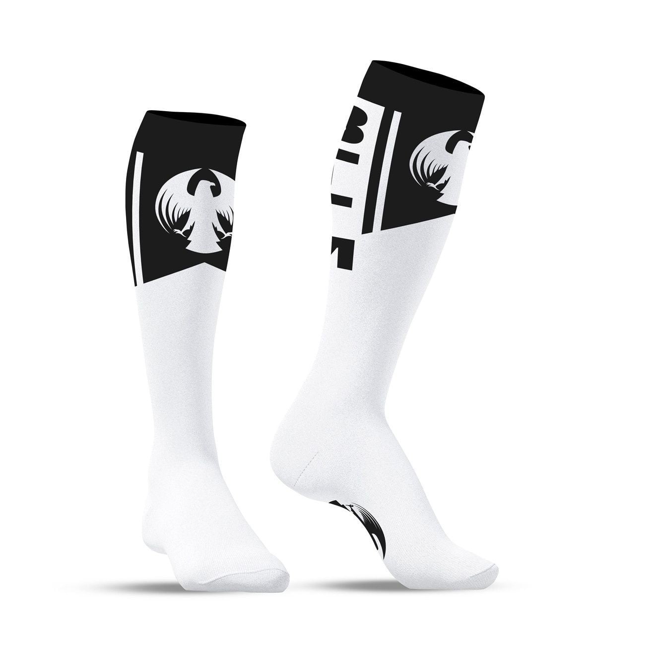 These comfortable white socks are decorated with giant BTTM lettering in contrasting black on the back. The Beyond Darklands festival logo can be found on the sides and soles. They are perfect for completing your outfit for this festival, but you can also wear them to other events or for everyday wear.
