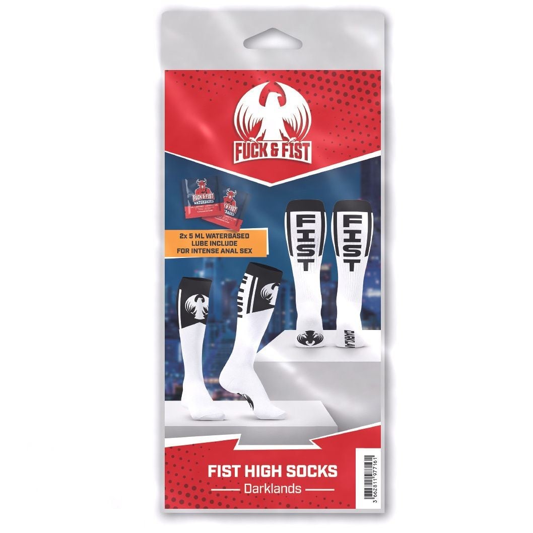 White knee socks with the FIST lettering and the Beyond Darklands festival logo. They also come with two samples of lubricant from Fuck & Fist. One size (39-45). Material: 85 % cotton, 10 % polyamide, 5 % elastane. More Information