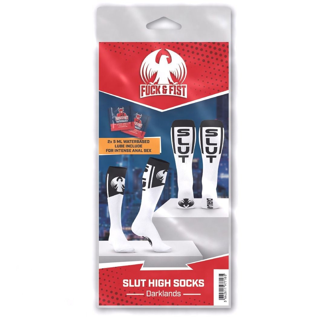 White knee socks with the SLUT lettering and the Beyond Darklands festival logo. They also come with two samples of lubricant from Fuck & Fist. One size (39-45). Material: 85 % cotton, 10 % polyamide, 5 % elastane. More Information
