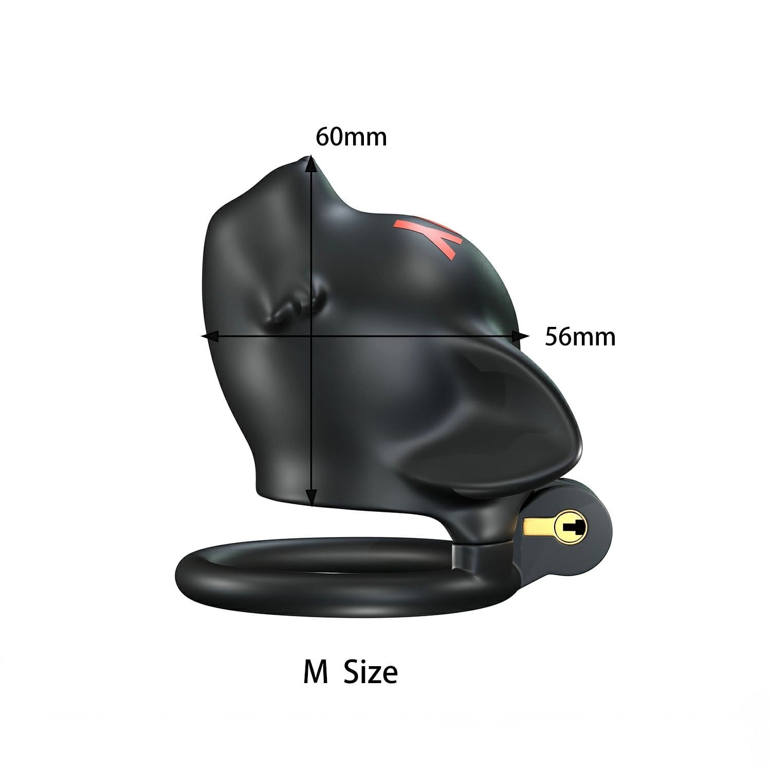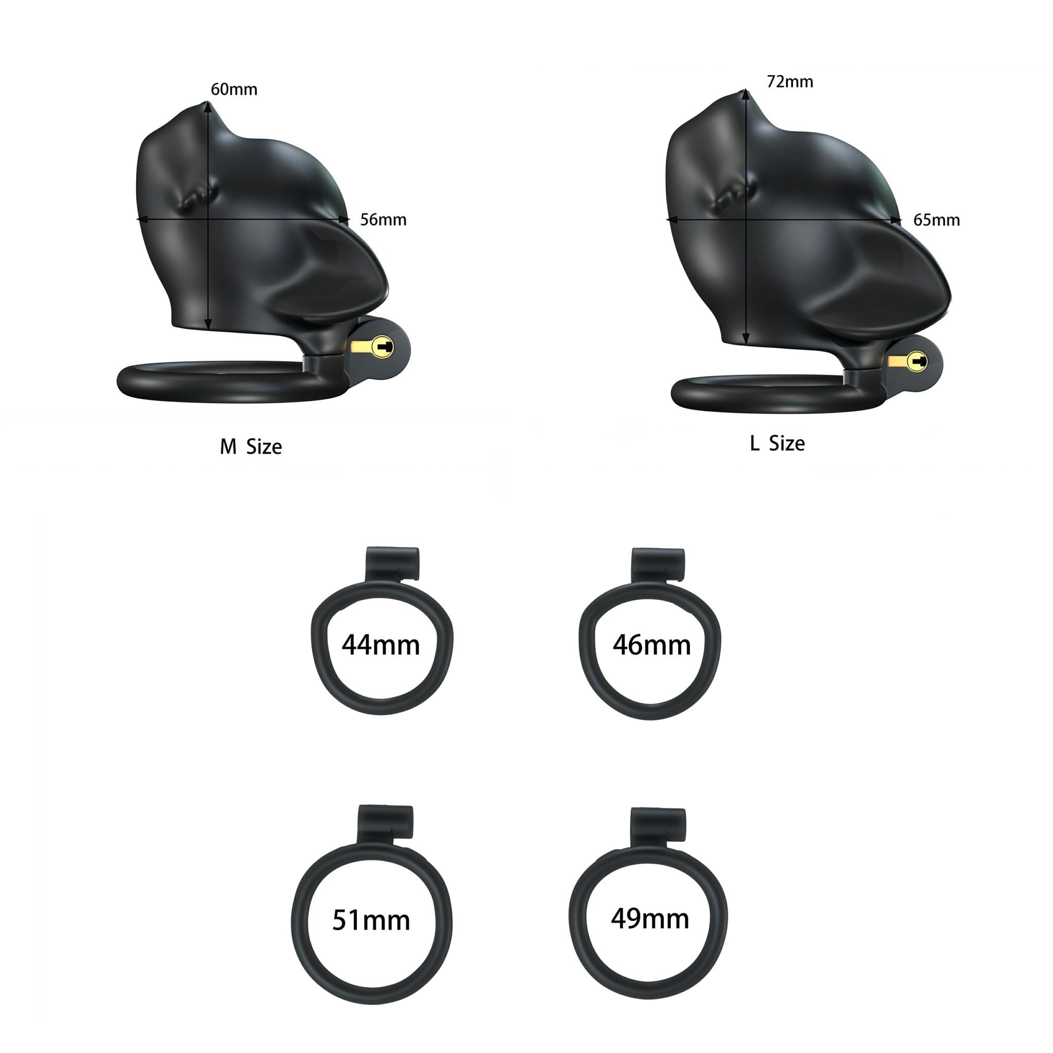 The cage is made of durable and lightweight plastic and equipped with a front opening for urination. For a perfect fit, it comes with 4 connecting rings of different sizes (44, 46, 49, and 51 mm). The package also includes a metal lock with two keys and five disposable plastic locks.