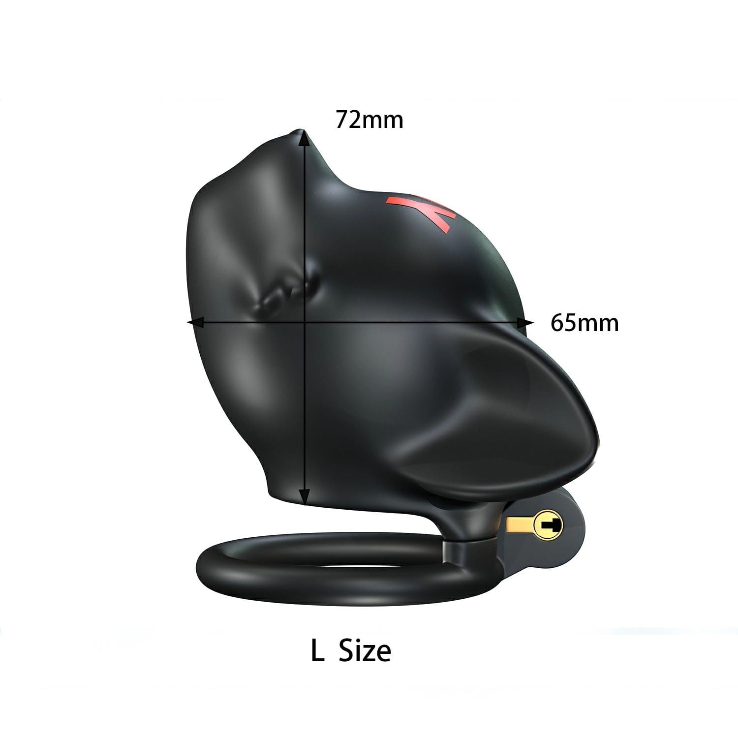 Plastic cock cage in the shape of an animal head, decorated with striking red stripes and a lock symbol. Available in two sizes. The package includes the cage itself, 4 sizes of rings, a metal lock with two keys, and 5 plastic locks. More Information
