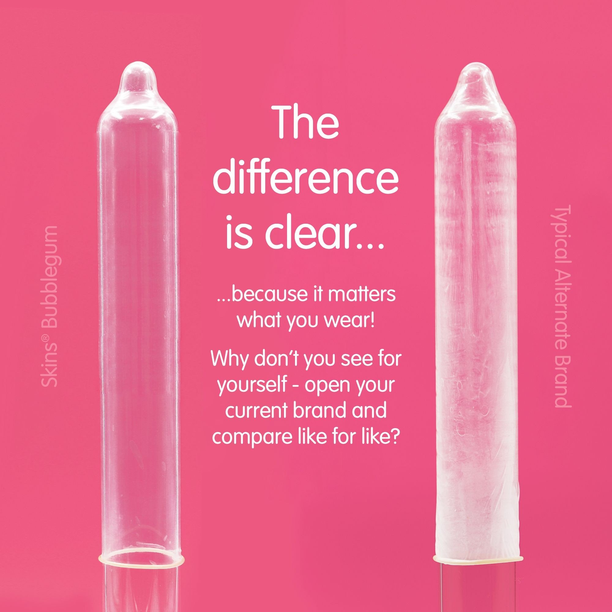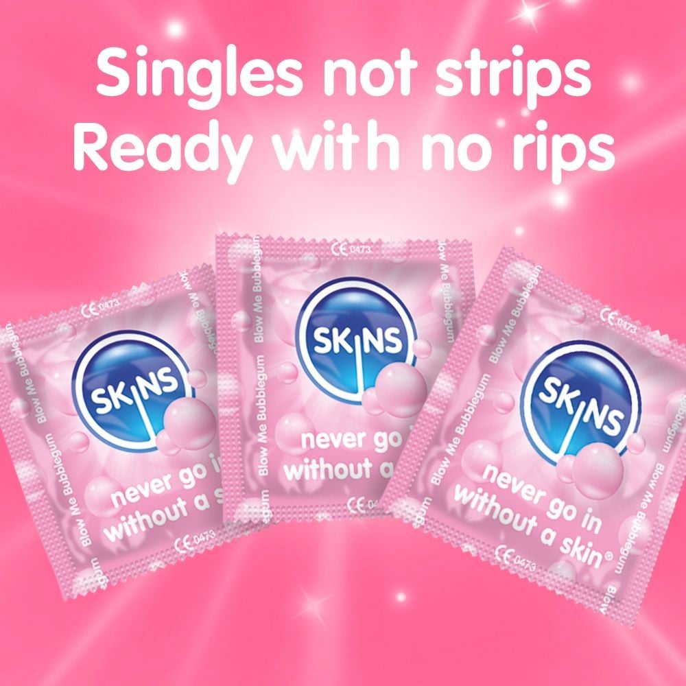 Sweeten your intimate moments with Skins condoms, which feel like a second skin. The condoms have a bubblegum aroma and flavour and do not have the typical latex smell. The transparent design ensures a natural look compared to standard, slightly milky-colored condoms.