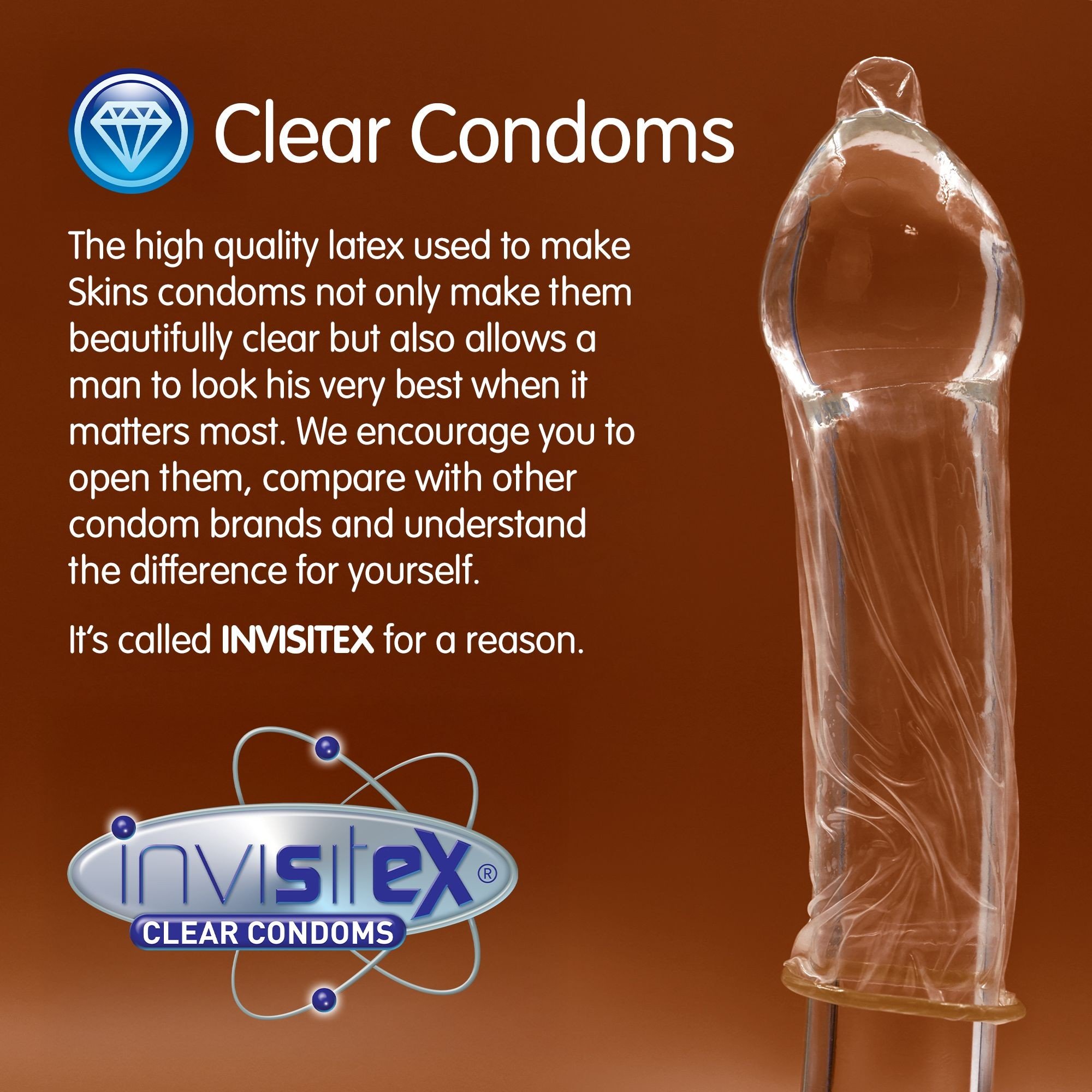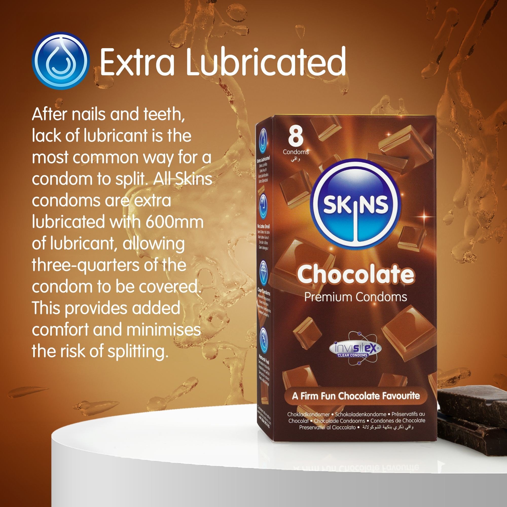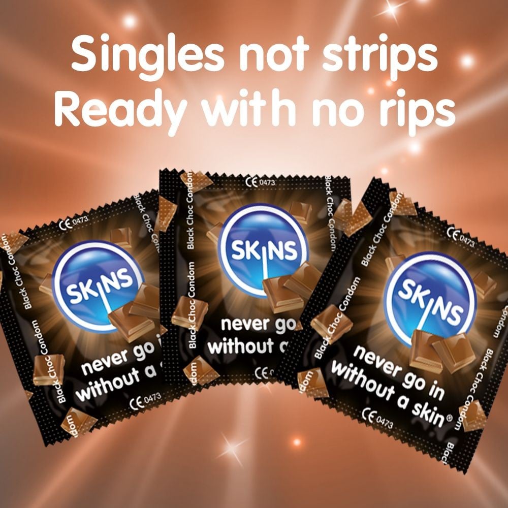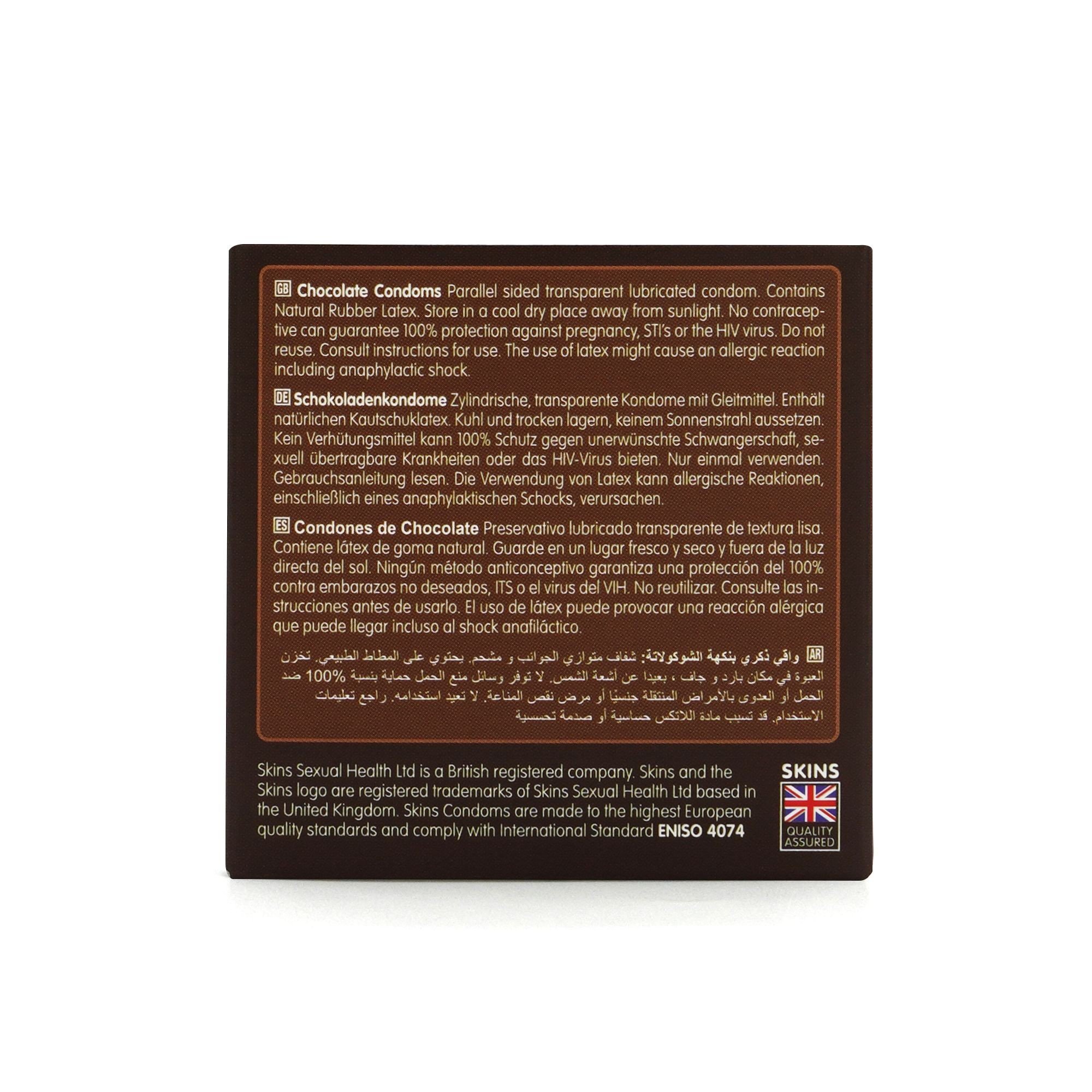 Looking for a way to combine your love of chocolate with sex? Try Skins condoms, which feel like a second skin. The condoms have a chocolate aroma and flavour and do not have the typical latex smell. The transparent design ensures a natural look compared to standard, slightly milky-colored condoms.